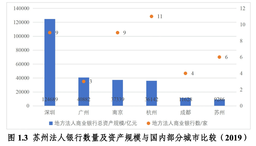“十三五”末,苏州法人金融机构规模相对偏小,行业内综合排名基本在全国20名开外,缺少具有全国影响力的法人金融机构,缺少公募基金、财产险等持牌金融机构,金融机构综合实力在全国31个金融中心城市中排名第13位。