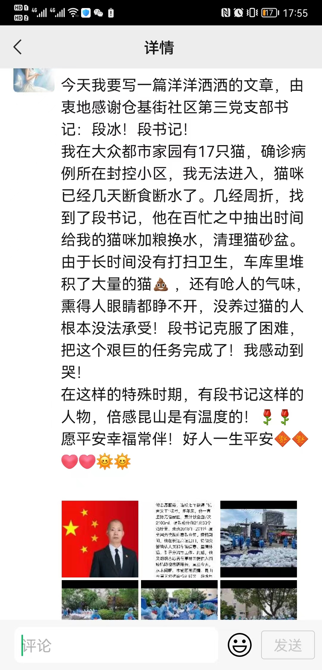 “小区封控期间,真的多亏了段书记等一批志愿者。他们在抗击疫情、照顾居民的同时,还每天帮我照顾17只流浪猫,让这些小生命安然生活,真的很暖。也让我深切感受到,在昆山,每一个生命都会被珍视,特别有爱。”聊起前段时间因大众都市家园小区突然封控,仓基街社区党总支委员、第三党支部书记段冰等志愿者悉心照料小动物的暖心事迹,作为当事人的庄燕女士感激不已。