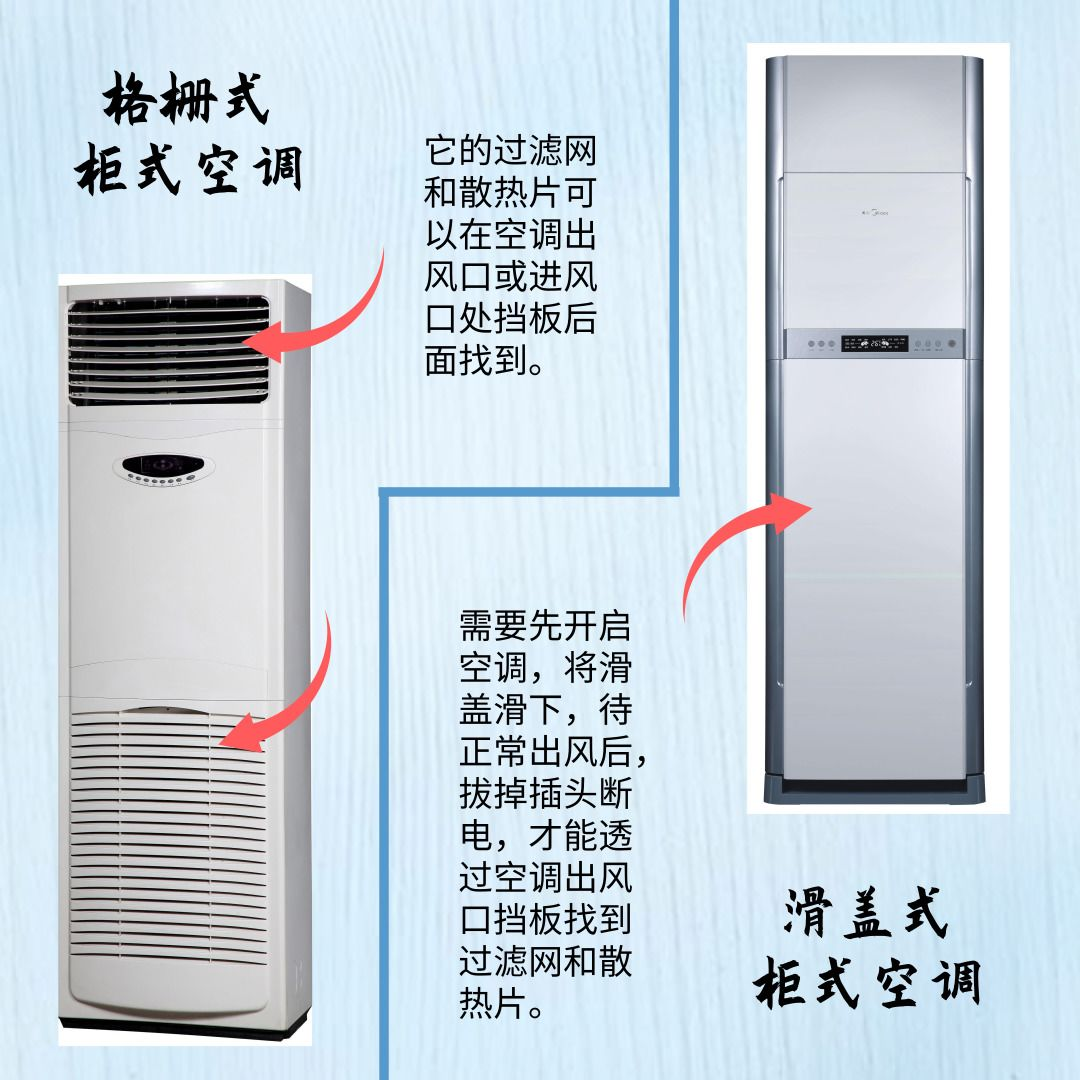 柜式空调的清洁方法也是一样的,只是柜式空调的过滤网,和散热片的位置不同。找到过滤网和散热片后,再按上述的步骤进行清洗。但是,由于柜式空调拆卸、清洗较为繁琐,且容易损坏电器,建议找专业的空调清洗公司进行清洗。