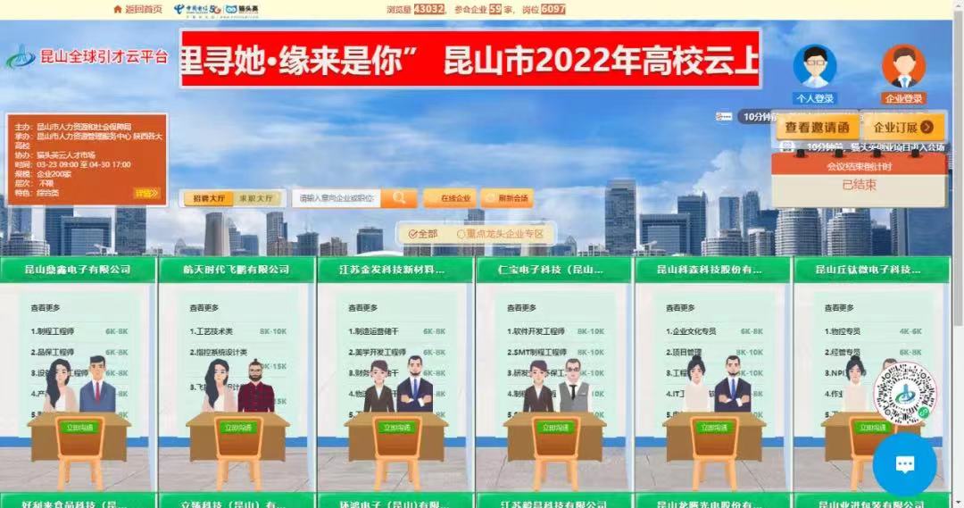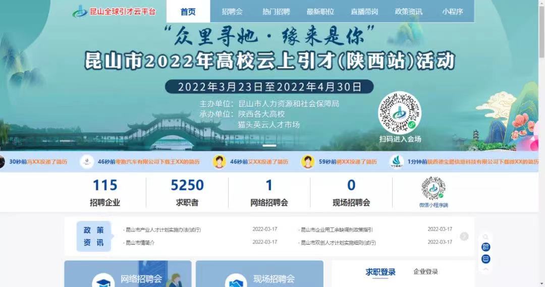 今年3月,面对疫情挑战,为了帮助高校毕业生求职应聘,助力企业招揽优秀人才,昆山市人社局依托猫头英云人才市场平台,携手陕西省20所本科和职业院校推出了“众里寻她·缘来是你”昆山市2022年高校云上引才系列(陕西站)活动。截至4月底,昆山有59家龙头企业、重点企业和人才企业参加招聘,线上提供就业岗位6097个,活动浏览量43087人次,累计收到简历2068份,通过“屏对屏”面试,初步达成就业意向927人次。