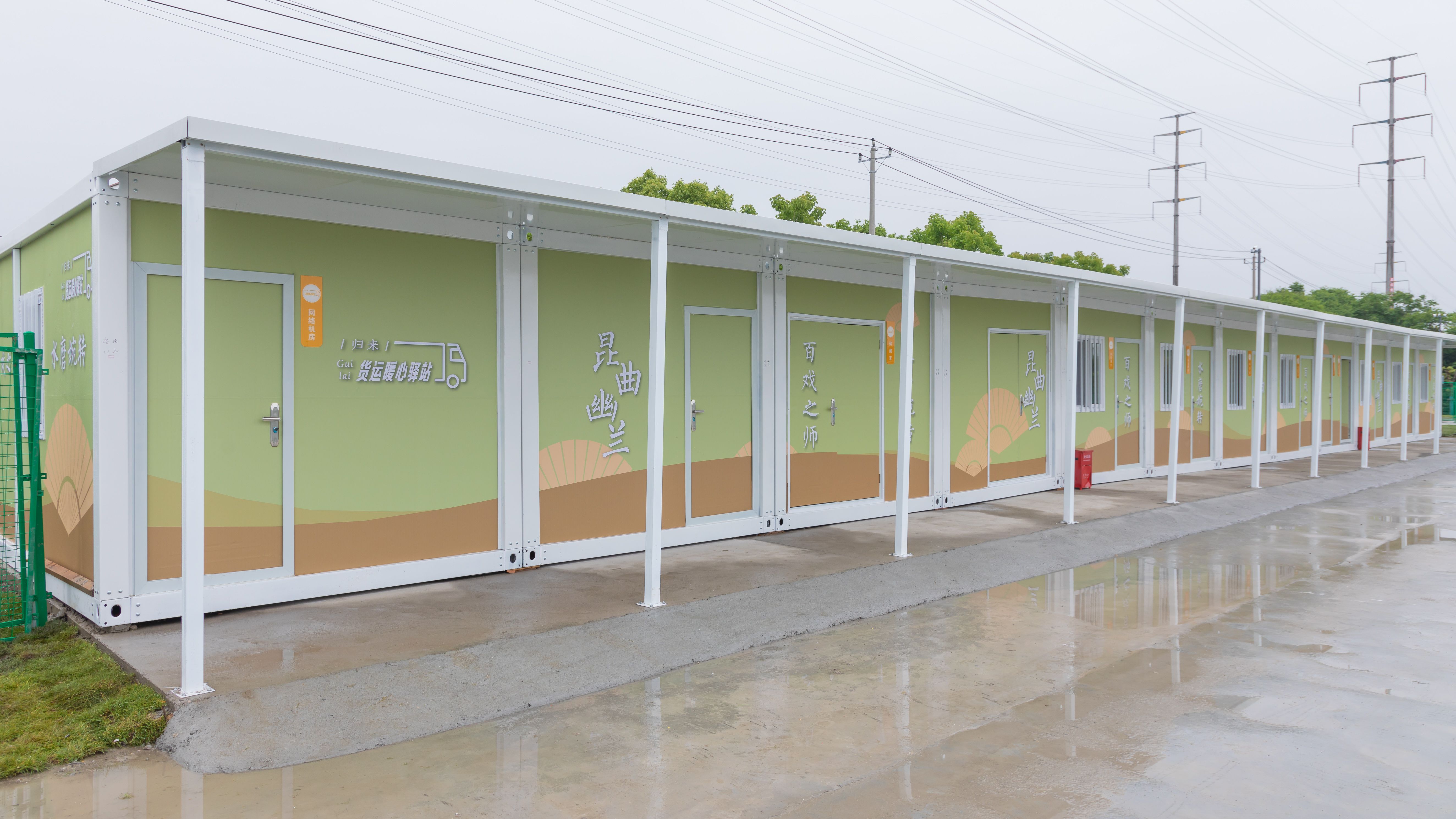 昆山货运暖心驿站位于周市镇宋家港路,占地81847.8平方米,可停放各类货车256辆。货运暖心驿站设有消杀区、静待区、停车区、引导车停放区以及卫生间、洗浴室等服务用房。驿站由专人负责,配置工作人员28人,包括安保、消杀、接驳等,24小时值班。货运暖心驿站实行规范管理,司乘人员单人单间、上门磁,集中管控期间禁止外出。货车进站便开展消杀,各区域每天开展日常消杀,房间隔离结束实行终末消杀。生活垃圾按照医疗废物处置进行清运,确保区域环境干净整洁。