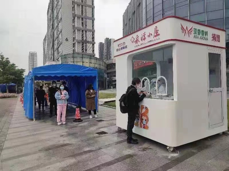 核酸采样小屋主要设置在大型商超、企业、社区等人群密集场所,方便市民群众核酸采样,设有等候区、登记采样区、清洁物品区、临时隔离区等功能分区,有明确统一的标识、编号,并设置包括开放时间、采样流程、联系方式、注意事项等内容的标牌。核酸采样小屋内置固定式紫外线灯、冷热空调,按需配备冷藏设施,部分小屋还装有高效空气过滤系统。