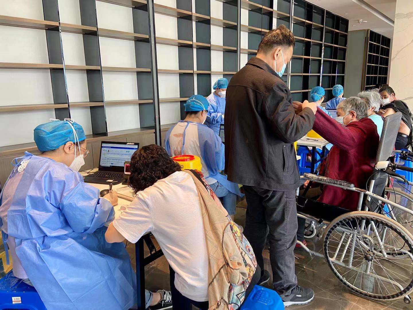 上午九点,在睿怡庭小区设置的新冠疫苗接种专场,记者看到现场按规定划分等候区、登记区、接种区、留观区,工作人员有序组织老人分批次完成疫苗接种。工作人员耐心与老人交流,询问健康状况,帮他们量血压,确保符合接种条件。