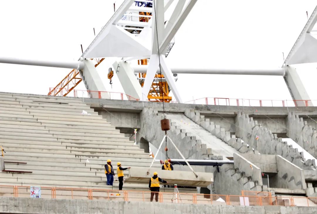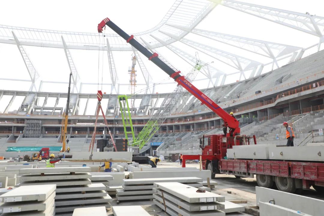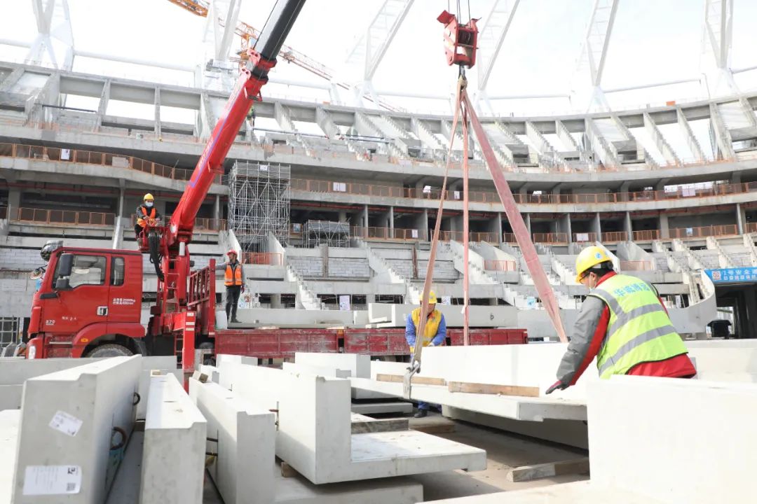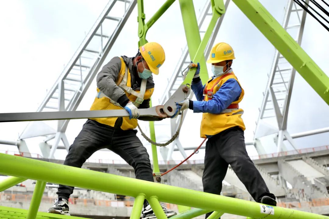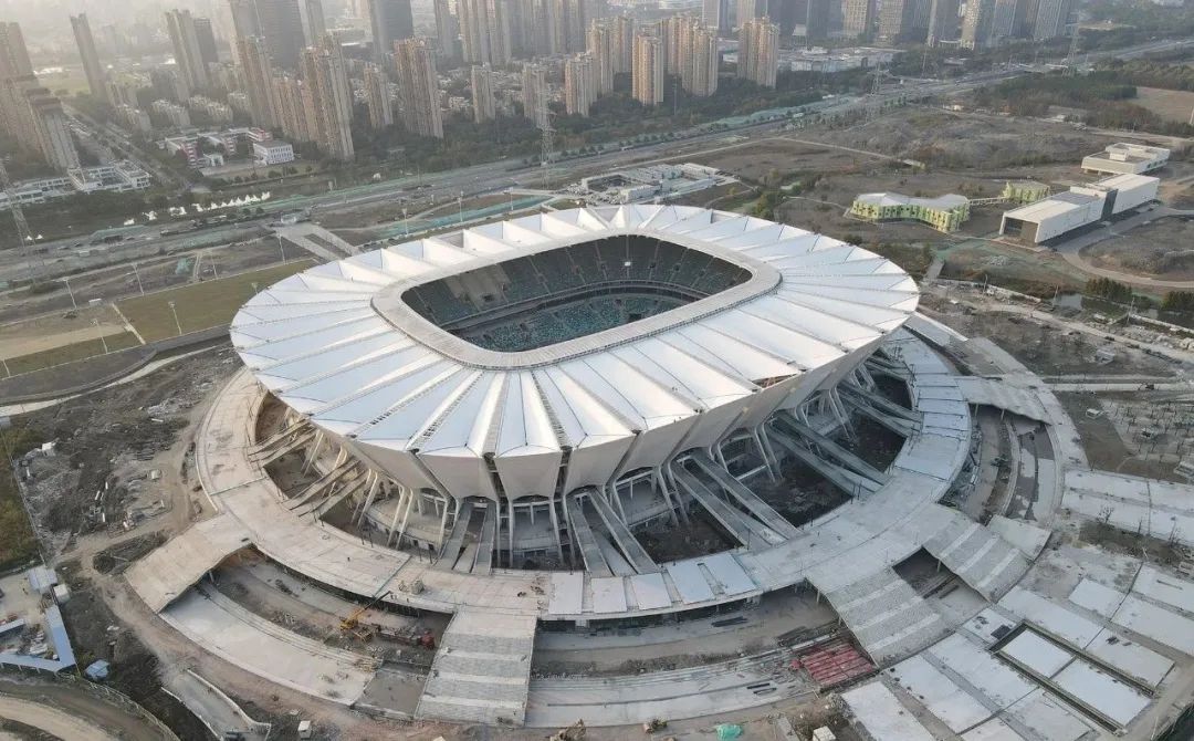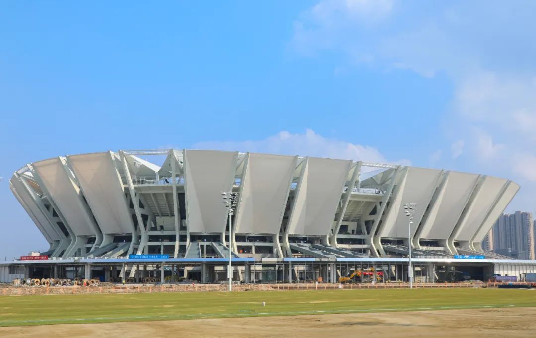 项目历时两年,在中建八局1100多名工友辛勤建设下,今年底基本完成建设任务。在建设过程中,我们克服了疫情反复带来的影响,尤其在背拉外倾索膜的施工过程中,克服了膜面单体面积大、应力控制难度大等施工难点,最终呈现出了带有昆山特色的“苏工折扇”造型。一个个困难的攻克就是为了形成简洁精致的外观效果,带给球迷更舒适的观赛空间。
