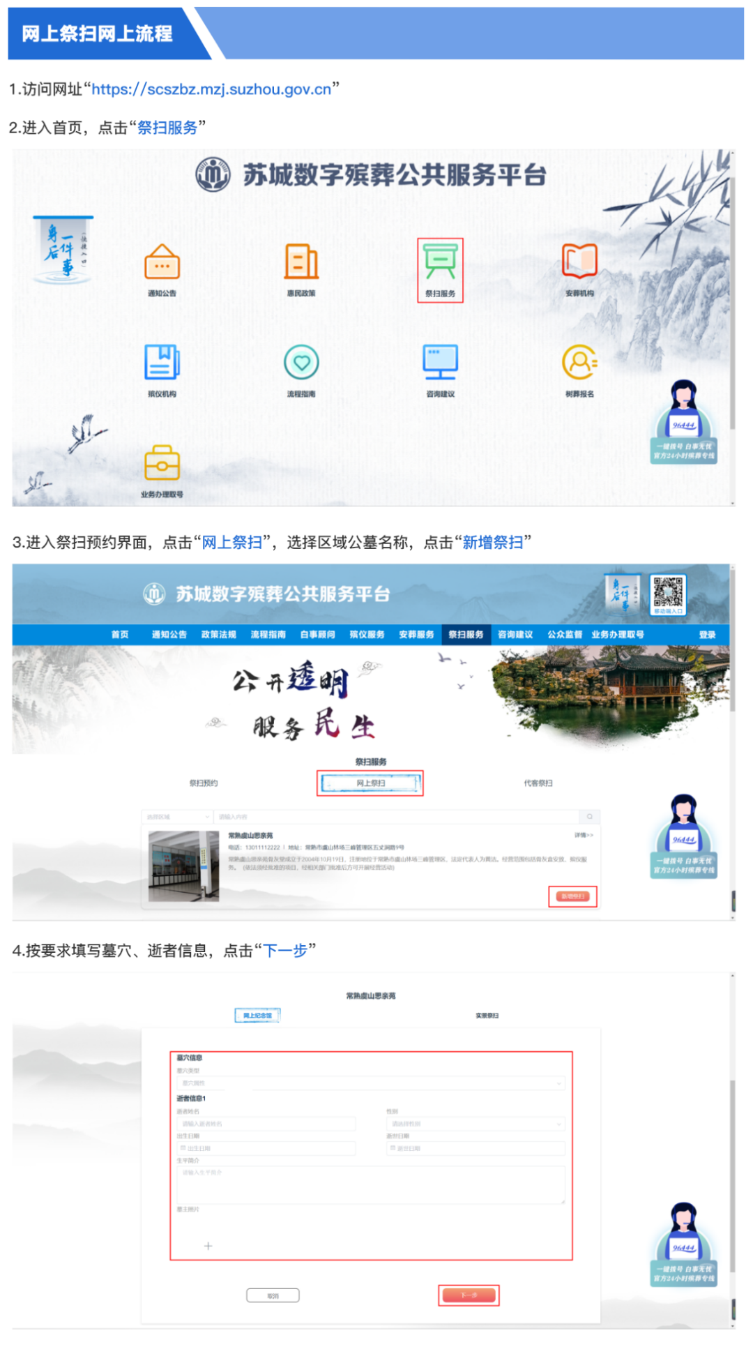 五、倡导多元祭扫。有条件的殡葬服务机构,可提供代为祭扫等安全多元的祭扫服务。有需求的群众可向骨灰安放(葬)公墓(骨灰堂)询问具体事宜,联系方式可登录“苏城数字殡葬公共服务平台”进入祭扫服务栏目或“96444”殡葬服务专线查询。