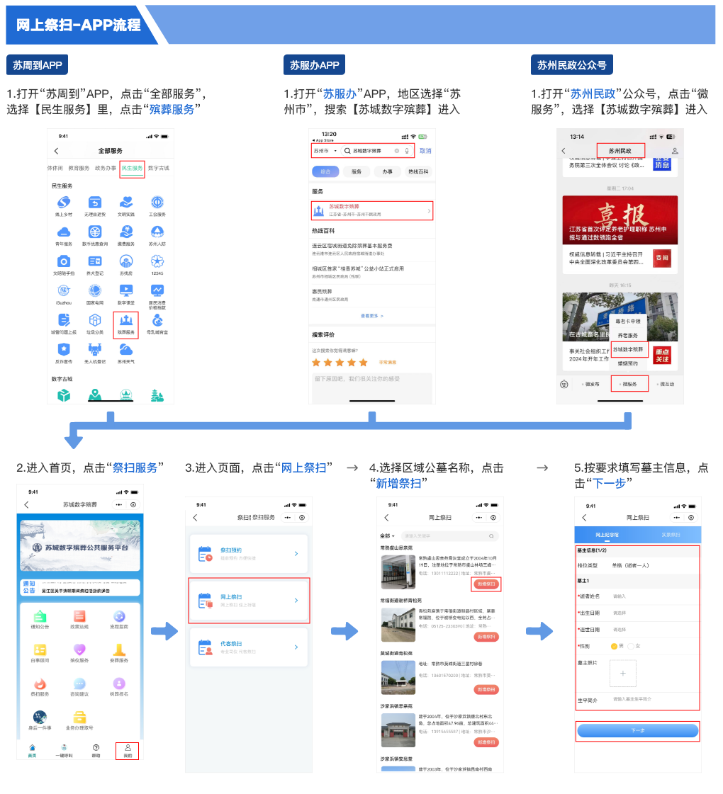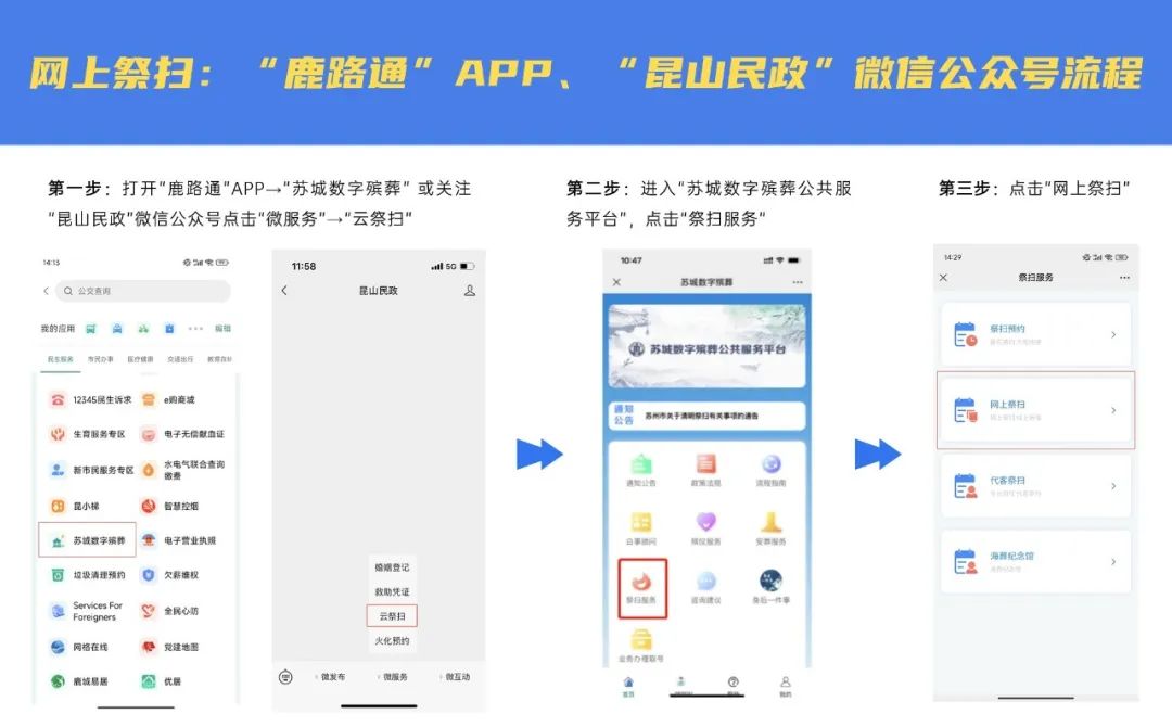 六、倡导网上祭扫。倡导通过“鹿路通”“苏服办”“苏周到”APP,“昆山民政”微信公众号,登录“苏城数字殡葬公共服务平台”,开展网上祭扫(网上祭扫操作指南附后)。