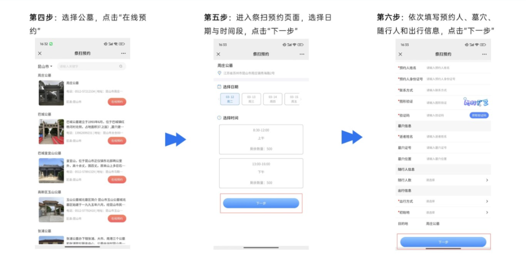 一、提前预约祭扫。市民可提前10天(含预约当天)通过“鹿路通”APP“苏城数字殡葬”板块,“昆山民政”微信公众号“云祭扫”板块,“苏服办”“苏周到”APP、 “苏城数字殡葬公共服务平台”网站在相应公墓预约祭扫(预约操作指南附后)。APP、网络预约有困难的市民,可拨打“96444”殡葬服务专线电话预约。如果预约当天祭扫人数较多,建议另择他日。