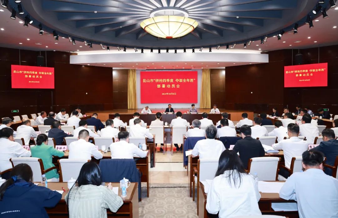 10月8日,“十一”长假后首个工作日,昆山召开“拼抢四季度 夺取全年胜”部署动员会。市委书记周伟出席并讲话,强调要深入学习贯彻党的二十大精神和习近平总书记对江苏、苏州工作重要讲话精神,认真落实省委和苏州市委最新部署,抓住一切有利时机、利用一切有利条件,聚力攻坚补短板,鼓劲加压促提升,以决战决胜的姿态和冲锋冲刺的状态,全力以赴抓好“两产两进两强”,拼抢四季度,夺取全年胜,为苏州乃至全省发展大局作出更大贡献。市委副书记、市长陈丽艳主持会议,市人大常委会主任冯仁新、市政协主席管凤良等市领导参加相关活动。
