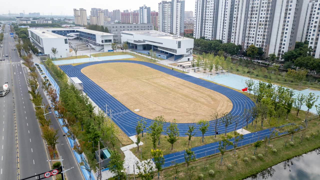 学校建筑简洁有力,开放空间、庭院、连廊、滨水小径等沿着主轴向前延伸。色彩选用白色、混凝土本色为主色调,再搭配蓝色和粉色,细腻回应青少年情绪与自我认同的表达。陆家中学党总支书记王正说:“校区功能分区简洁明了,西端运动区、中央教学区、东端生活区。建筑以开放、亲和、活力为基调,其中前卫的体育馆与图书馆最具代表性——开放的阅览与藏书空间,将校园的开放精神展现得淋漓尽致。”