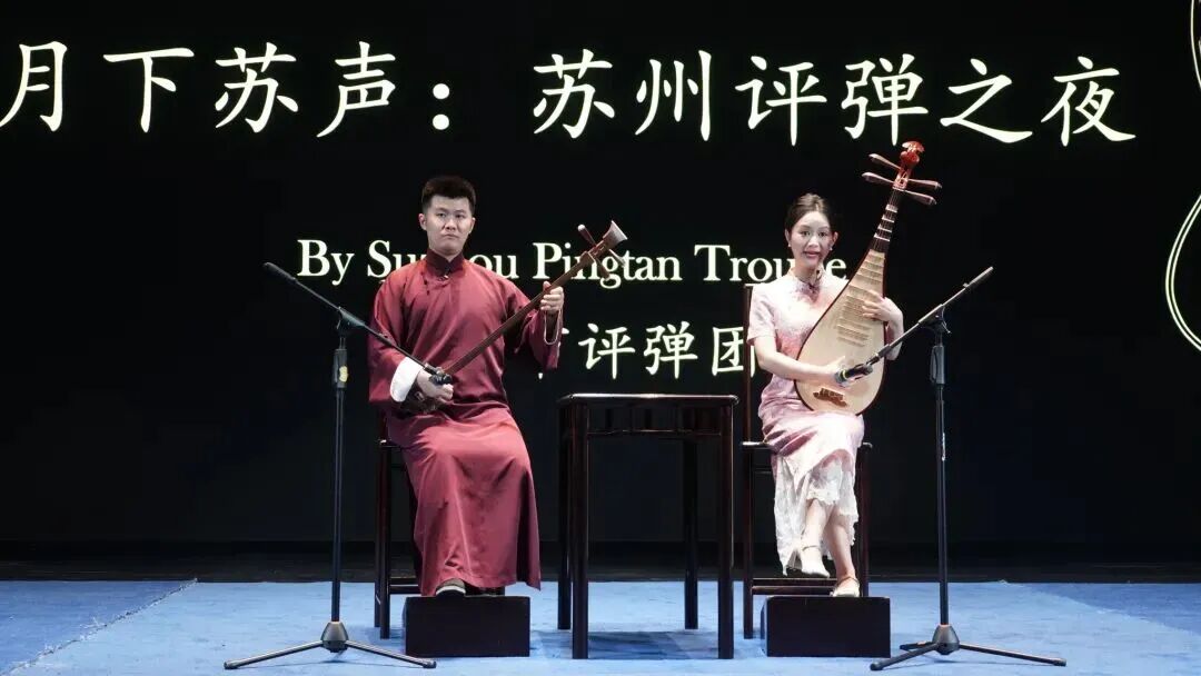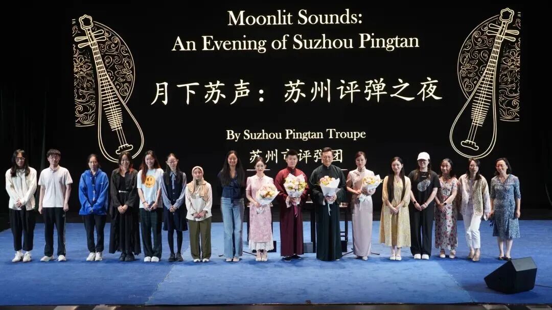 三弦拨响,琵琶和鸣。9月25日晚,昆山杜克大学剧场内丝竹悠扬,苏州市评弹团携“月下苏声:苏州评弹之夜”演出精彩亮相。软糯的吴侬软语间,百余名中外师生共赴这场“最江南”的文化盛宴。