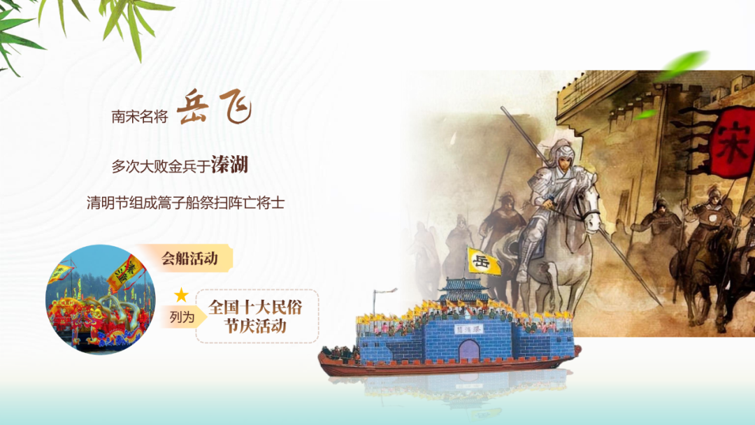 南宋名将岳飞多次大败金兵于溱湖,溱潼百姓按当地习俗,每年清明节组成篙子船祭扫阵亡将士,后来演绎成现在的会船习俗,与傣族的泼水节等一起,被列为全国十大民俗节庆活动。