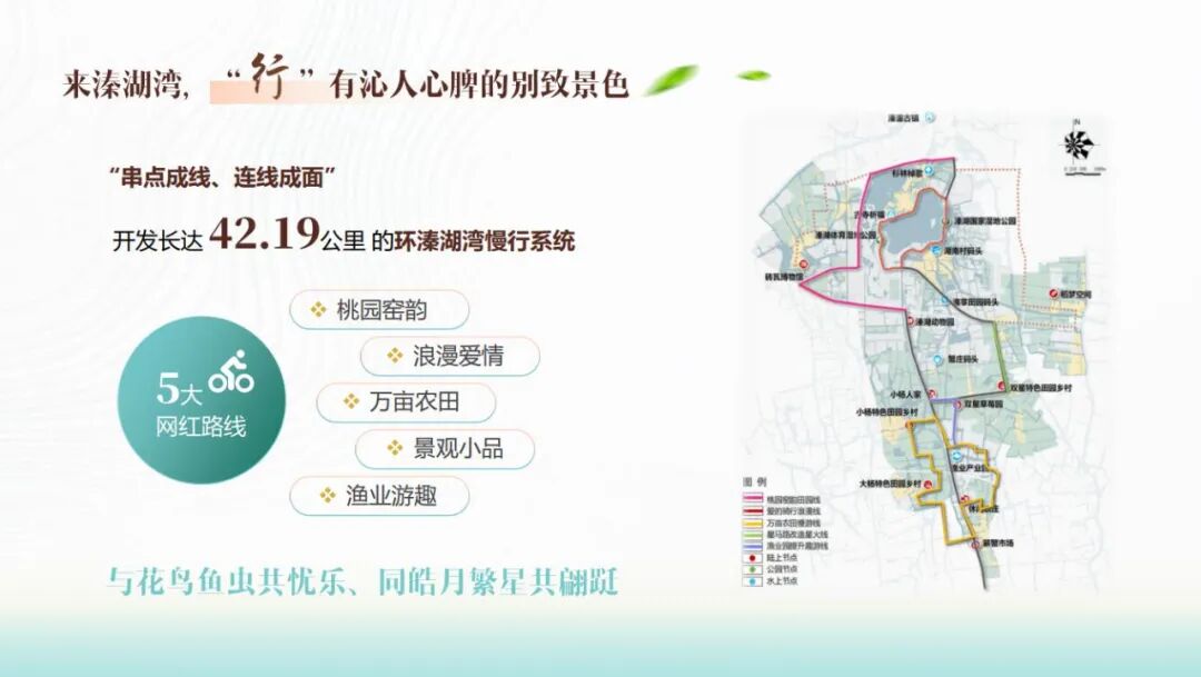 姜堰通过“串点成线、连线成面”,开发长达42.19公里的环溱湖湾慢行系统,包含桃园窑韵、浪漫爱情、万亩农田、景观小品、渔业游趣5大网红路线,随处可“与花鸟鱼虫共忧乐、同皓月繁星共翩跹”。如果您走累了,可以在 9个特色驿站驻足歇脚、品尝小吃、露营拍照、休闲购物,感受“一站一景点”的多重快乐。