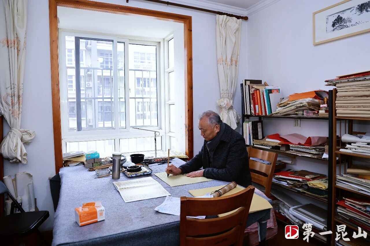 书柜最上层摞着厚厚一沓参展证书。唐万全是中国书法家协会会员,拿过江苏省“亭林杯”三等奖,也获得过昆山市顾炎武法治思想书法展一等奖,其作品曾入展全国第四届楹联展、全国第七届楹联展、全国第二届楷书展。那些证书压得很平整,他不常翻动,脚边那只帆布包用了许多年,包口有些磨损发黄,此刻正敞着口,等着装进红纸、墨瓶、砚台和笔帘。