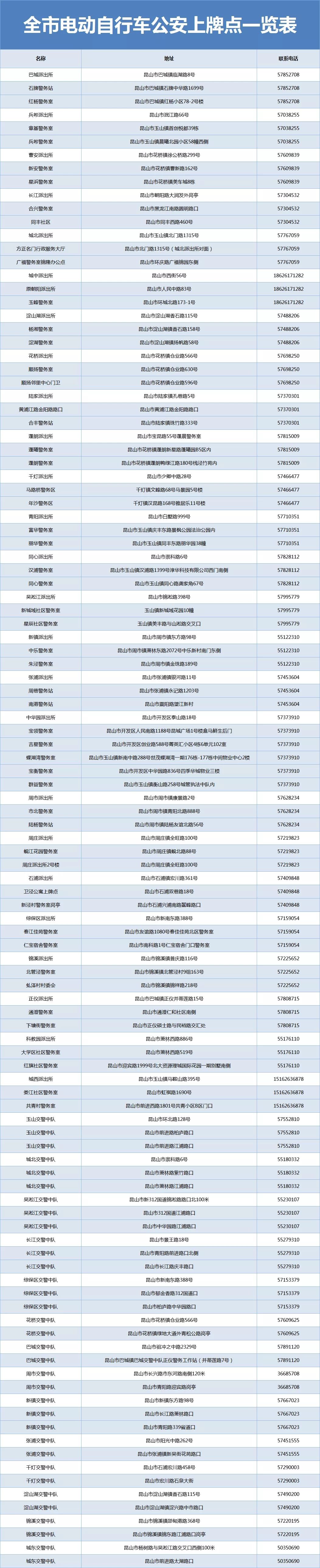 全市电动自行车上牌点位公布如下(白色底为原有上牌点,蓝色底为新增上牌点):